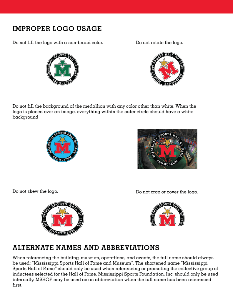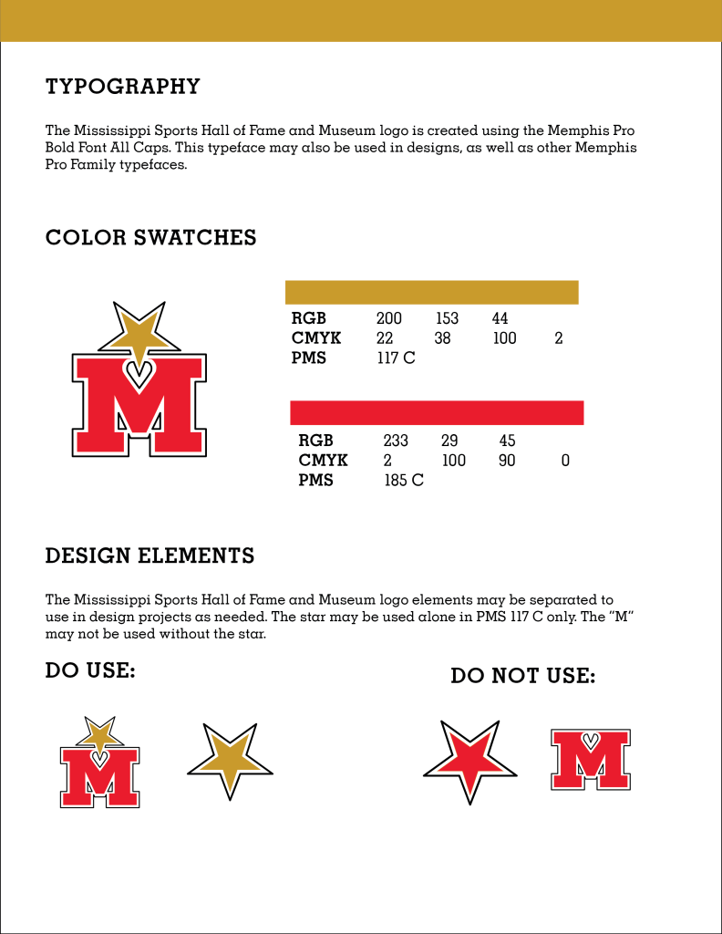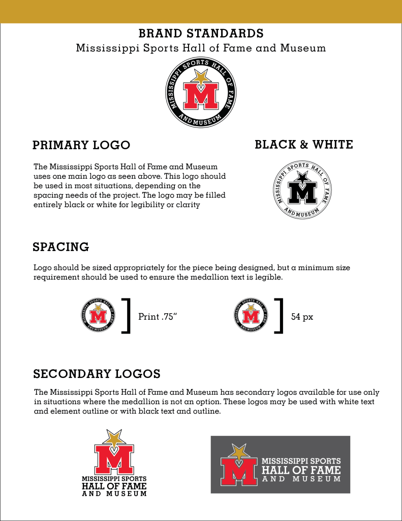 As the Director of Marketing for the Mississippi Sports Hall of Fame & Museum, I developed the Brand Standards featured here and oversee their consistent application across all branding efforts.