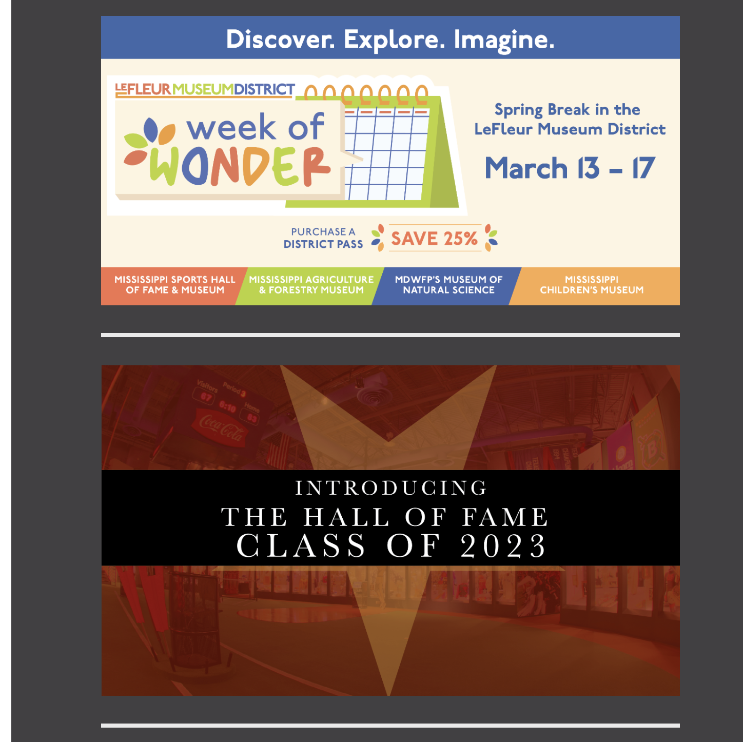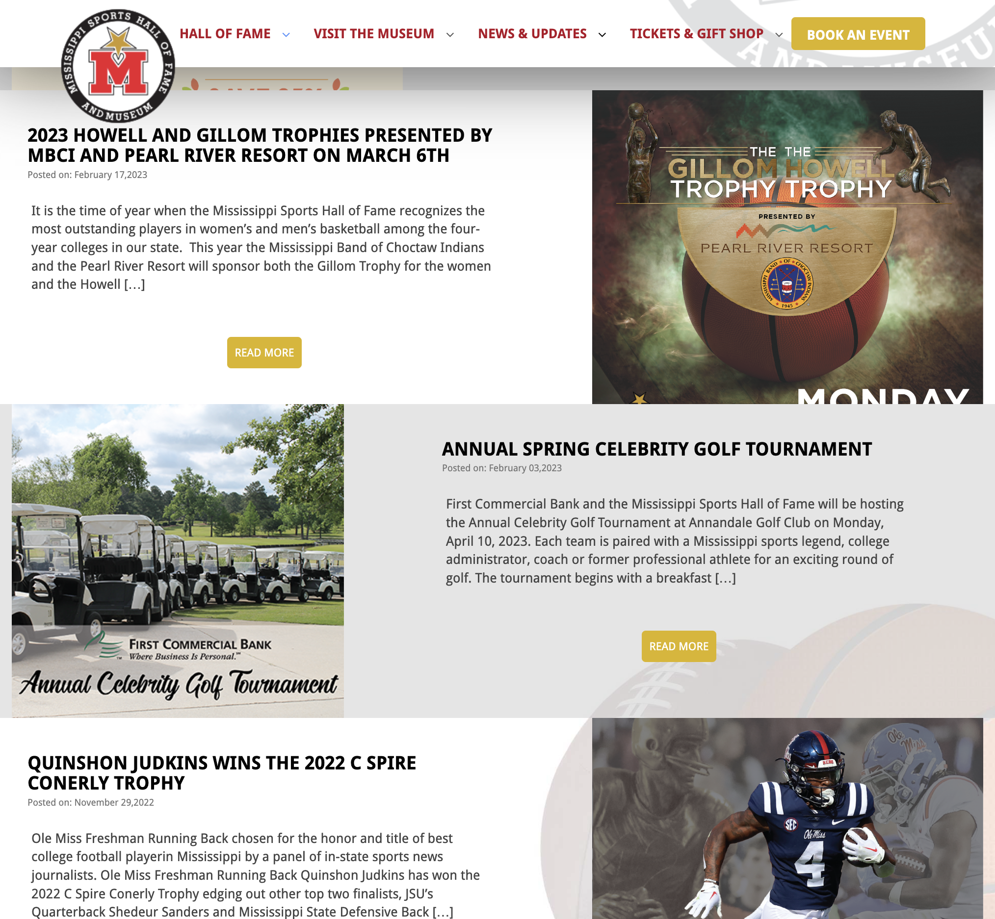 In 2019, I led the redesign of the Mississippi Sports Hall of Fame website, creating all graphics and content for the site. I continue to manage and update it daily, ensuring a dynamic and engaging online presence.